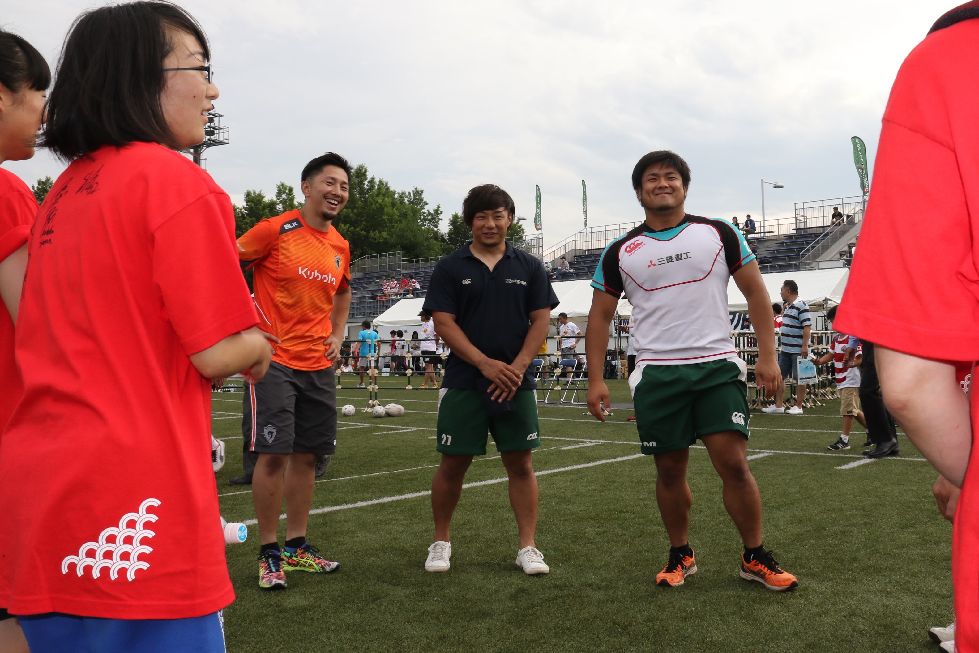 この日は8人の中学生が試合会場の味の素スタジアムを訪れ、まずは、隣接するグラウンドで開催されていたストリートラグビー体験イベントに稲橋良太選手と参加。飛び入り参加してくれた三菱重工相模原ダイナボアーズの佐々木駿選手、中村拓樹選手や、元日本代表 選手と一緒にラグビーのプレーを体験しました。